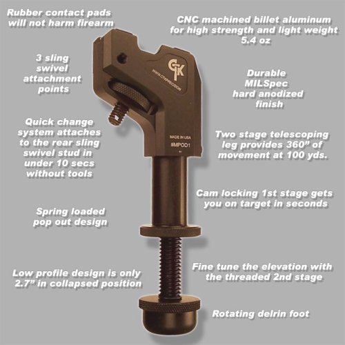 The CTK P3 Ultimate Monopod with quick change system is fast and easy to use. SAVE NOW! Durable, accurate and a snap to use! The CTK Ultimate Monopod is made of CNC machined-billet aluminum for high strength and light weight (just 5 1/2 ozs.). The quick change attachment system attaches to the rear sling swivel stud in under 10 seconds without tools. And it allows for precise elevation adjustments. Rubber contact pads will not harm firearms; 3 sling swivel attachment points; Spring-loaded pop-out design; Low profile design is only 2 3/4" in collapsed position; 2-stage telescoping leg provides 360" of movement at 100 yds.; Rotating foot made of tough Delrin synthetic; Cam locking first stage gets you on target in seconds; Fine tune the elevation with the threaded second stage; Durable mil. spec. hard anodized finish. Don't miss out... get one now! Order Today! CTK P3 Ultimate Monopod